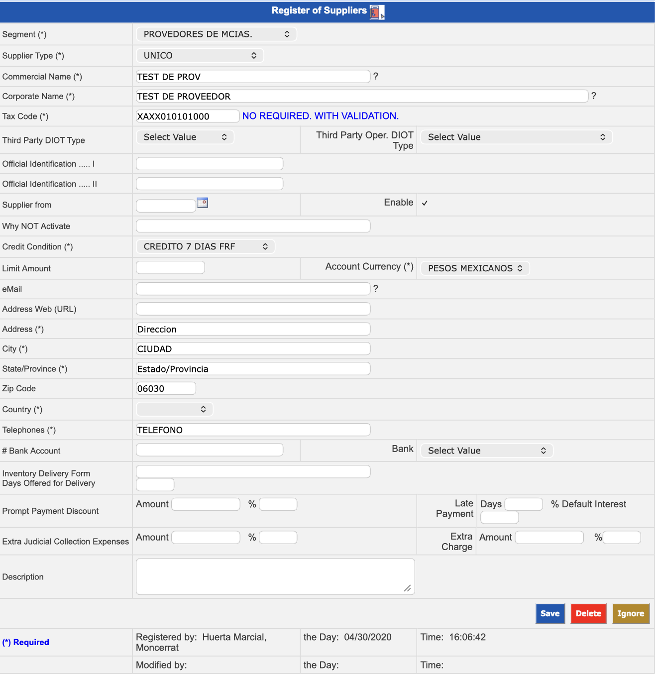 | Third Party DIOT Type ^^ | Select supplier type: Domestic, foreign or global, according to Diot (Mexico only) |