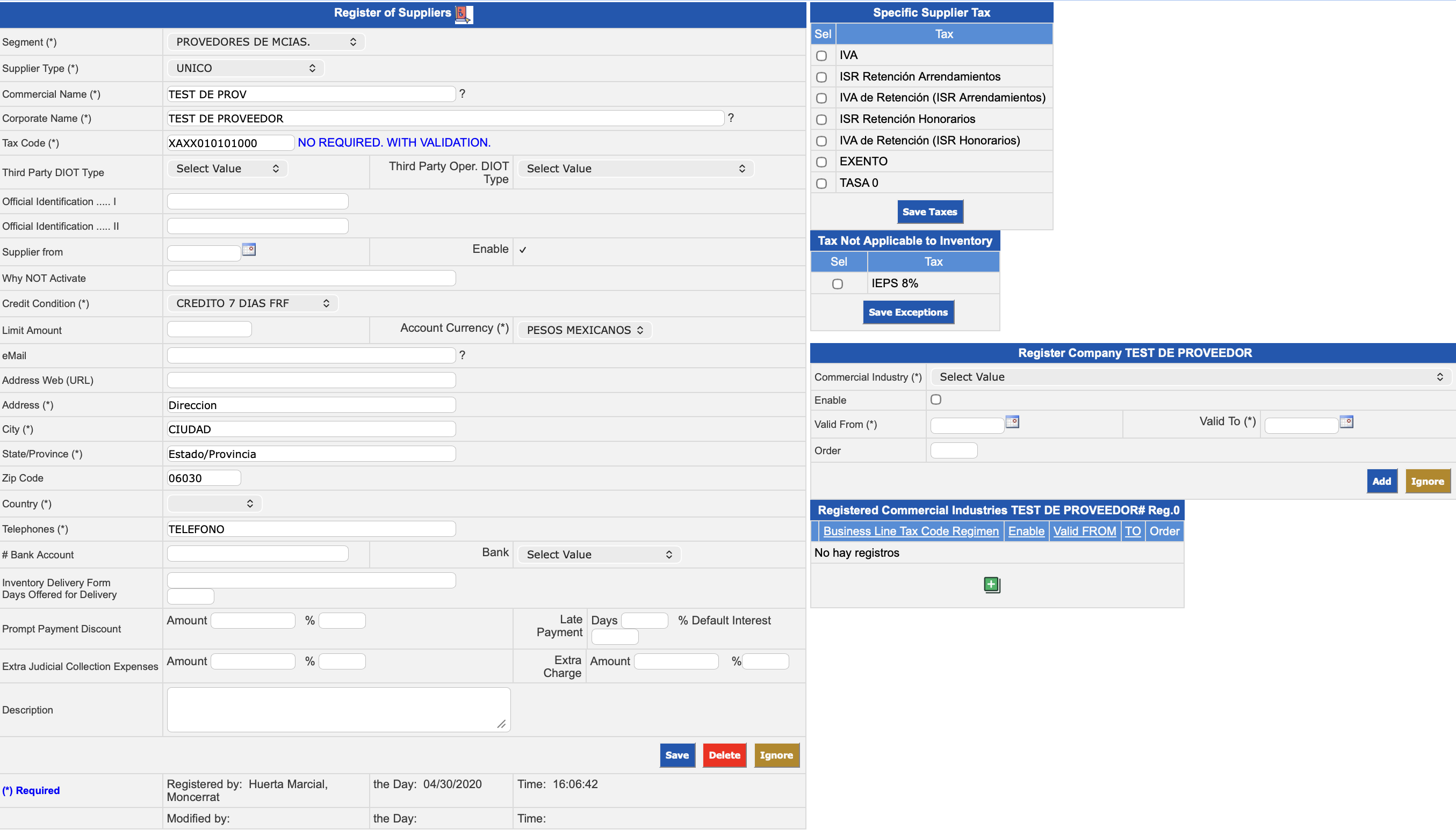 When modifying a supplier record, the Register Company window is enabled for cases where the supplier expands its business activity. In this section, you can enter the new commercial industry, indicate whether it is active, define the validity date range, and assign the corresponding order number.