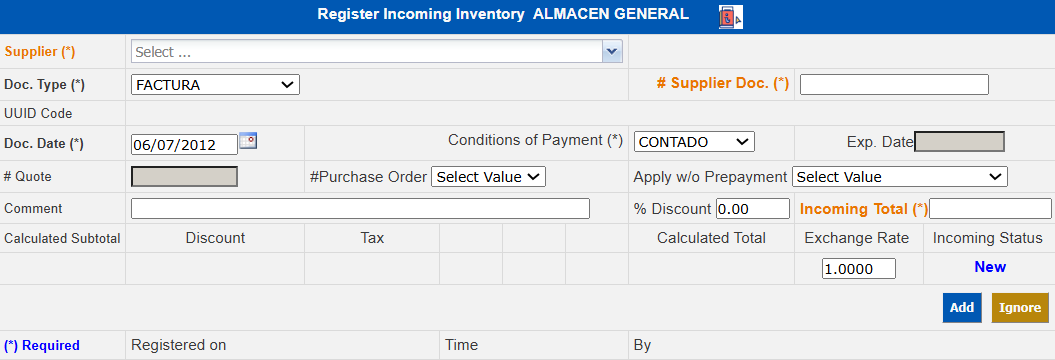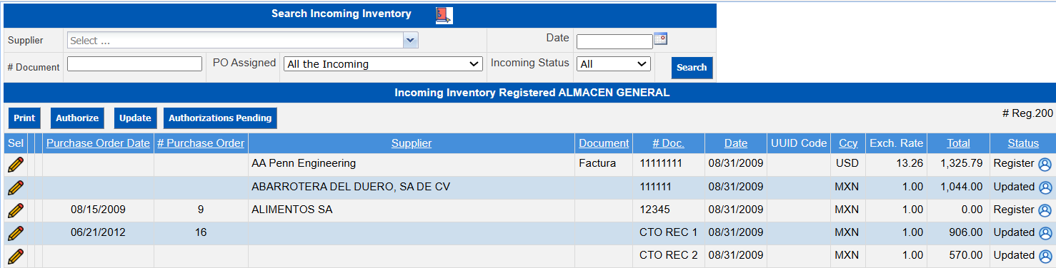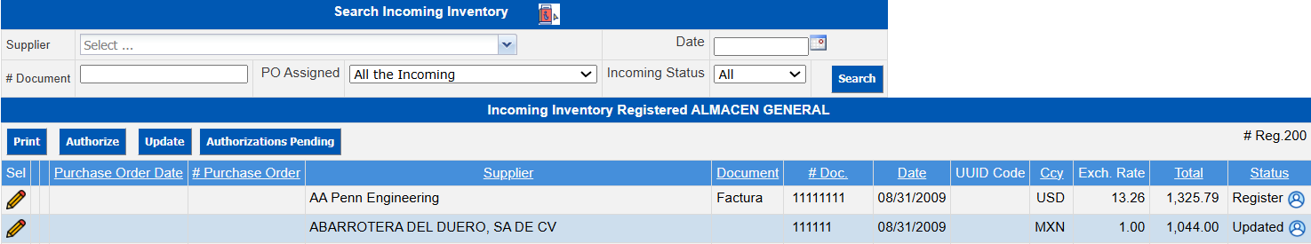 The Authorize Incoming Entries section will be displayed. This section contains two panels: Search Documents to Authorize and Authorize Incoming Inventory Entries.