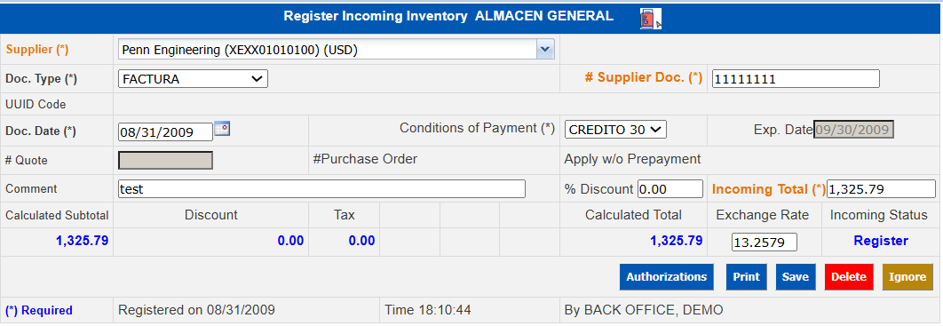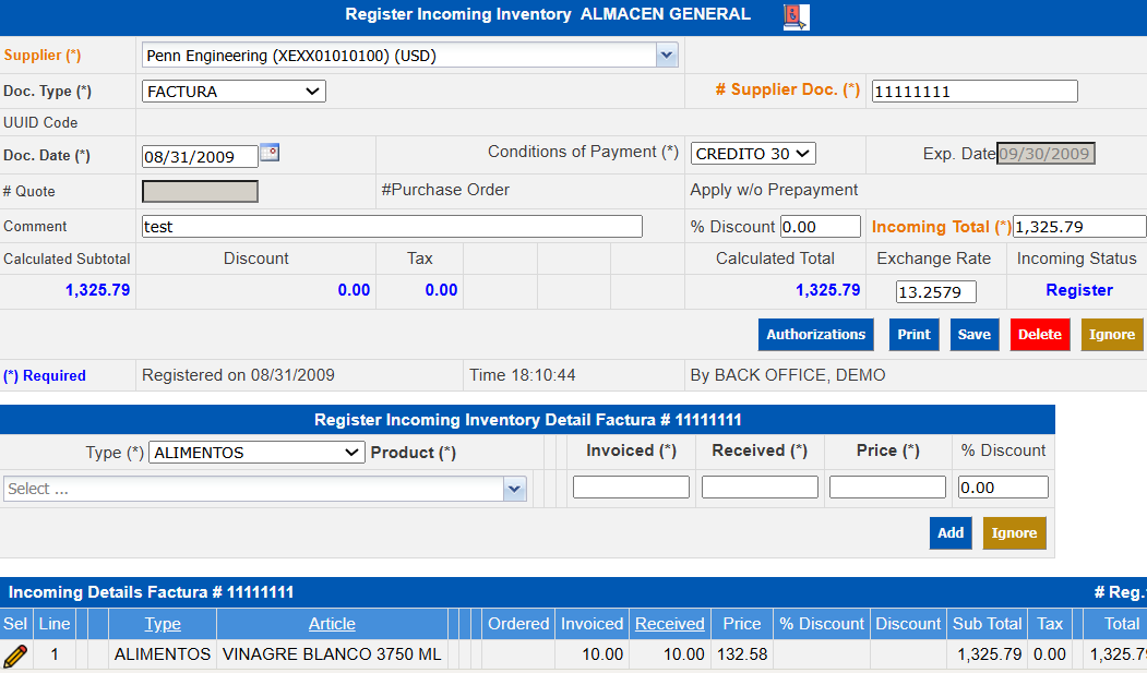 Click the Authorize button in the Incoming Inventory Invoiced section.