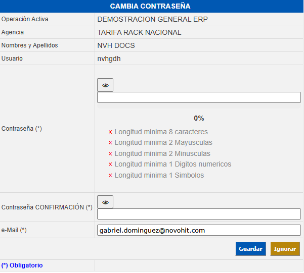 Se puede modificar también el campo de correo electrónico (e-Mail (*)), mostrará el correo electrónico ingresado con anterioridad.