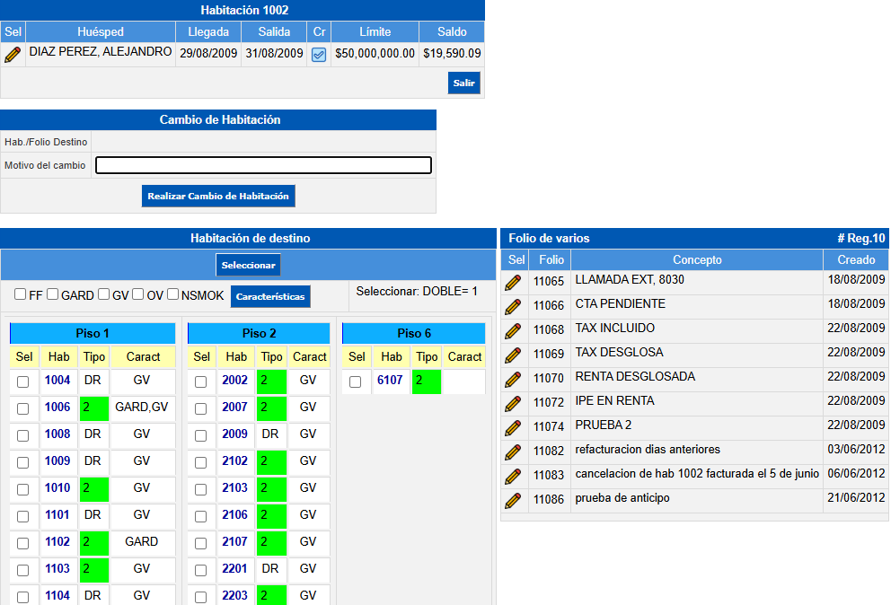Para seleccionar la habitación de la lista de habitaciones registradas haga clic en el Icono Lápiz.Al seleccionar la habitación se mostrarán cuatro ventanas:En la primera ventana se mostrará la habitación seleccionada (la que va a modificar).La segunda ventana es donde deberá indicar un motivo del cambio de la habitación. El número de habitación aparecerá cuando haya seleccionado la nueva habitación de la siguiente ventana.La tercera ventana es donde podrá elegir la habitación a la que realizará el cambio. Una vez seleccionada haga clic en el botón Seleccionar.Regrese a la segunda ventana (Cambio de habitación) y haga clic en el botón Realizar Cambio de Habitación..La sección Folio de varios muestra los cargos y movimientos asociados a la cuenta del huésped que no dependen de la habitación asignada. Esta información se presenta como referencia durante el proceso de cambio de habitación, permitiendo al usuario verificar el estado de la cuenta antes de realizar el cambio, asegurando la continuidad y correcta asociación de los cargos existentes
