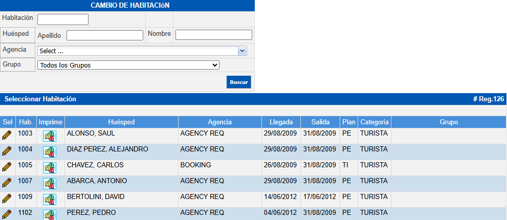 Agencia: Filtra los registros según la agencia asociada a la reserva o estadía del huésped.Grupo: Permite filtrar los registros que pertenecen a un grupo determinado o visualizar todas las estadías, facilitando el cambio de habitación en contextos de gruposEn caso de conocer el número de habitación se puede indicar y al presionar el botón Buscar se accederá directamente a esa habitación, en caso contrario se mostrarán todas las habitaciones que cumplan con los parámetros de búsqueda.