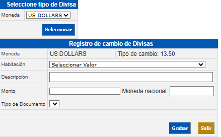 En el campo Moneda de la sección de Seleccione tipo de Divisa indicar la moneda presionando el botón Seleccionar. En la sección Registro de cambio de Divisas se mostrará el importe del tipo de cambio para el tipo de moneda seleccionada.