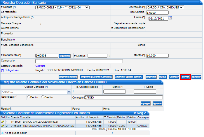 Localice el Cargo a Cuenta que desea eliminar a través de una búsqueda en la sección Busca Operación Bancaria o directamente en la sección Operaciones Bancarias.