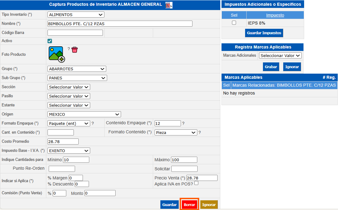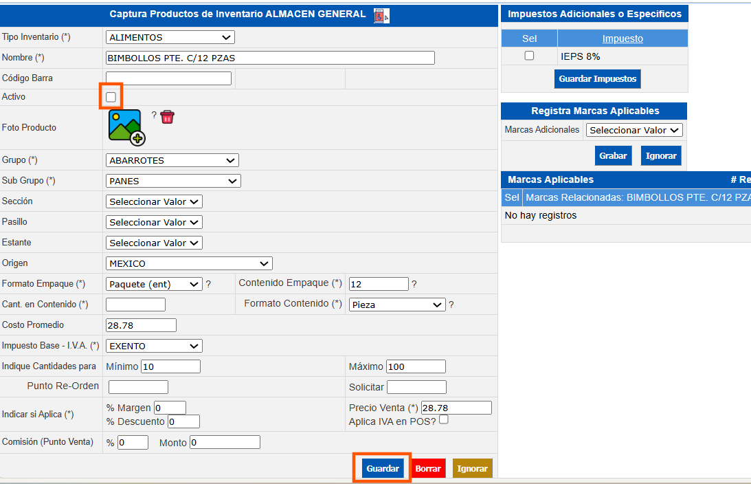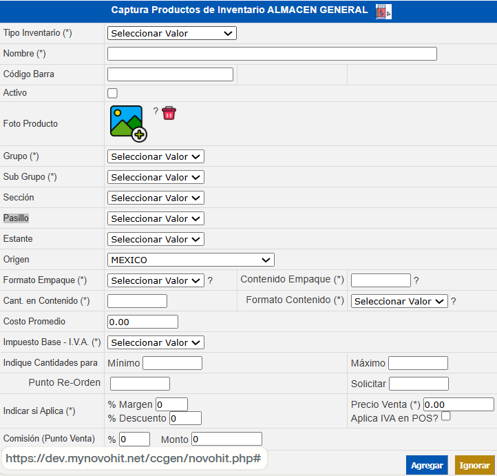 Campo Descripción Tipo Inventario Seleccione a qué tipo de inventario pertenece el producto/articulo. Nombre * Denominación del producto/artículo que desea buscar. Por ejemplo: bolsa para basura 25*25, bolsa para basura 30*25. Código Producto Es el número asignado automáticamente por el sistema. Código Barra Capture el número de código de barra en caso que proceda. Nombre Genérico Denominación que puede agrupar a un grupo de productos/artículos. Por ejemplo: el genérico para el ejemplo mencionado en el campo "Nombre" sería bolsa para basura. O denominación no comercial de un producto en caso de tenerlo. Activo Al marcar este check box se solicita que muestre los productos/artículos que tuvieron movimientos pero se encuentran desactivados, es decir, que no están activos. Aplica Mod. Mantenimiento Al marcar este check box se especifica que el producto/artículo que aplica al módulo de mantenimiento. Foto Producto Permite adjuntar una imagen representativa del producto para su identificación visual. Grupo * Seleccione en qué grupo está el producto/artículo del tipo de inventario.Por ejemplo:Tipo de inventario: AlimentosGrupo: Perecederos. Sub Grupo * Definir a qué subgrupo pertenece el producto/artículo. Por ejemplo:Tipo de inventario: AlimentosGrupo: PerecederosSubGrupo: Frutas. Sección Permite clasificar el producto dentro de una sección específica del almacén/establecimiento Pasillo Indica el pasillo físico donde se encuentra ubicado el producto. Estante Especifica el estante exacto donde está almacenado el producto. Origen País donde se realizó el producto/artículo. Controla Vencimientos Determina si tiene vencimiento. Controla Lotes Define si maneja lotes. Formato Empaque * Seleccionar la forma en que el producto viene empacado. Contenido Empaque * Cantidad del producto dentro del empaque. Cantidad de Contenido* Cantidad de unidades contenidas según el formato seleccionado. Formato Contenido* Seleccionar la forma del contenido del producto (ML, G, KG). Costo Promedio Ingresar el valor del costo unitario del producto (Novohit utiliza como método de valuación los costos promedios). Impuesto Base -IVA Seleccione la tasa del impuesto al valor agregado que le corresponde al producto. Indique Cantidades para Mínimo Capturar la cantidad mínima del producto que debe estar en stock. Indique Cantidades para Máximo Ingresar la cantidad máxima del producto que debe estar en stock. Punto Re-Orden Límite de existencia del producto para un nuevo pedido. Solicitar Cantidad de solicitar del producto. Indicar si Aplica * % Margen Ingresar el porcentaje sobre el precio de costo para calcular el precio de venta. Indicar si Aplica * Precio Venta Cuando aplica que el producto es para venta, capturar el precio de venta. Indicar si Aplica * Descuento Importe de porcentaje de descuento, en caso de que aplique. Comisión (Punto Venta) % Ingresar el porcentaje de comisión sobre venta del producto. Comisión (Punto Venta) Monto Capturar monto de comisión sobre venta del producto. Precio Venta (*) Precio de venta del producto cuando aplica para comercialización. Aplica IVA en POS? Indica si el impuesto configurado debe aplicarse en las operaciones realizadas desde el POS.