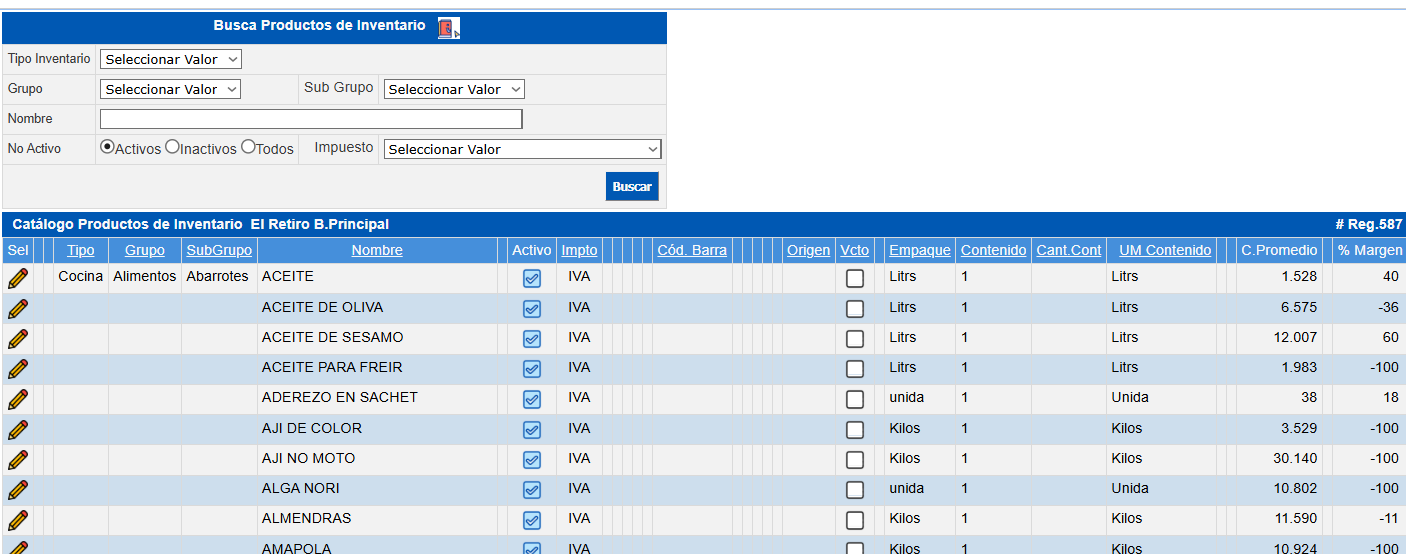 Busca Productos de Inventarios : se realiza la búsqueda de Productos/Artículos.Catálogo Productos de Inventario : muestra los productos/artículos ya registrados. Se pueden ordenar de forma ascendente o descendente haciendo clic en las columnas: Código, Tipo, Grupo, SubGrupo, Nombre, Cód. Barra, Origen, Vcto. (controla vencimiento), Lote, UM Empq (Empaque), contenido, Empq Contenido.Para realizar cualquier acción, deberá previamente seleccionar el almacén o bodega con la cual se estará trabajando.