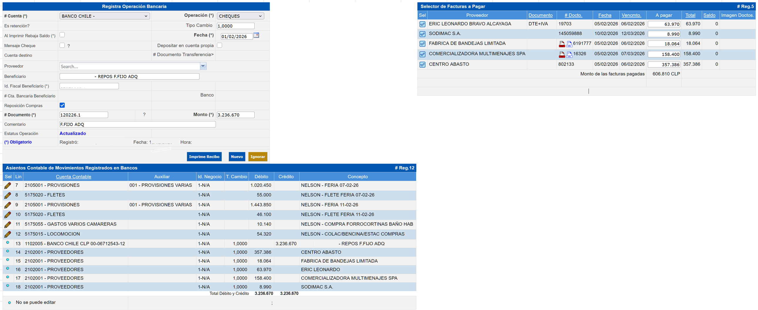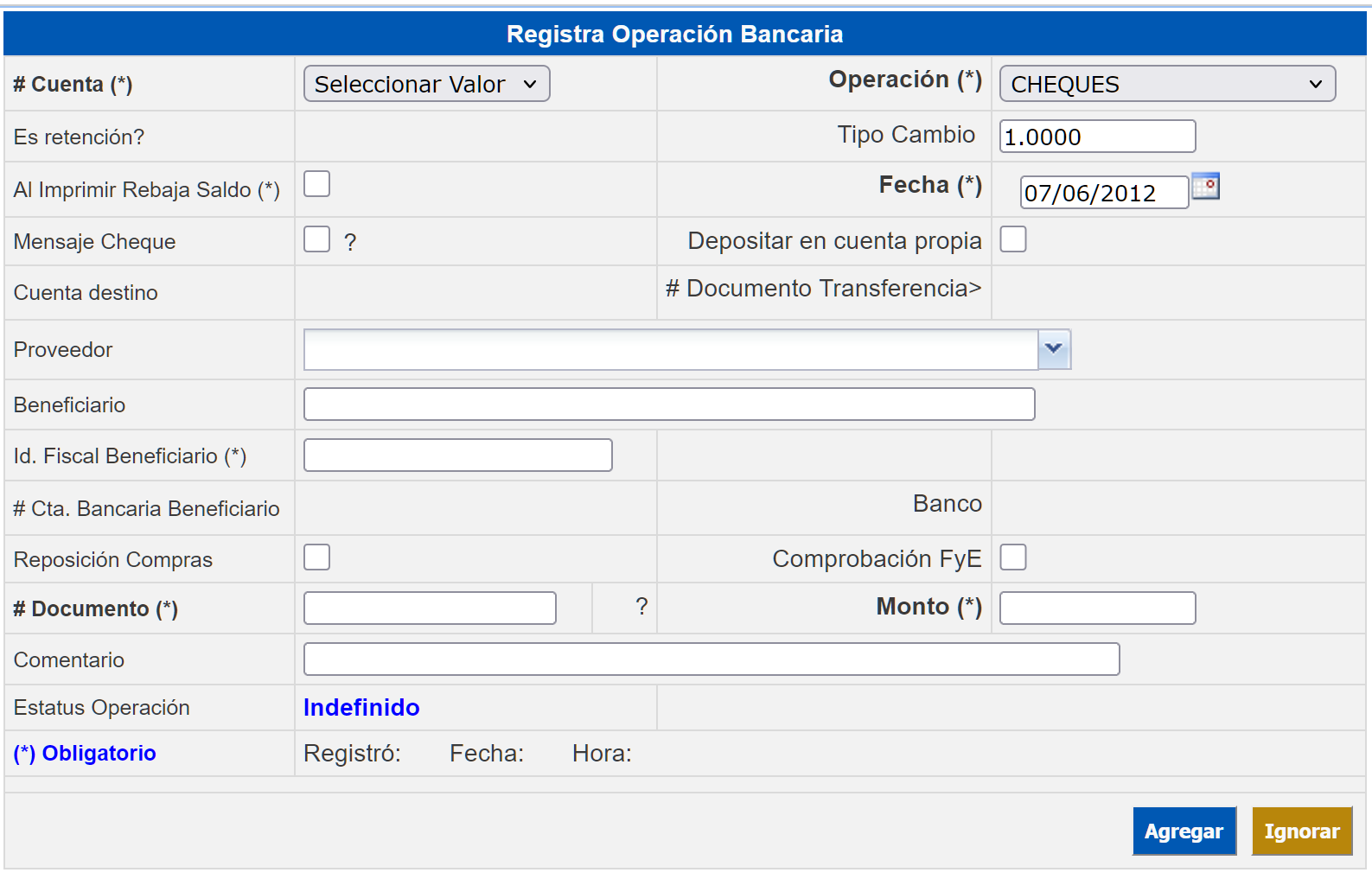 Al imprimir rebaja saldo* Haga clic en el check box para que al imprimir el cheque el importe del mismo se rebaje del saldo. Cuenta destino Si hizo clic en el check box del campo "Depositar en cuenta propia" este campo se habilitará para elegir la cuenta de destino del traspaso. #Documento Transferencia Se captura el número del documento de la transferencia que se está registrando. Tipo CambioSe despliega automáticamente 1 cuando la cuenta seleccionada es en pesos. Pero si es una cuenta de moneda extranjera (dólares) se captura el tipo de cambio correspondiente. Este tipo de cambio se captura en la aplicación Tipo de Cambio Diario Divisas. Proveedor Capture el nombre del proveedor o haga clic en el list box para seleccionarlo. Los proveedores deben ser ingresados en el Catálogo de Proveedores previamente. Se elige este campo cuando se paguen cuentas registradas en el módulo de Cuentas por Pagar. Al presionar el botón Agregar se desplegará la sección Selector de Facturas a Pagar con las facturas pendientes de pago; seleccione las que correspondan al pago que se registra haciendo clic en el botón Guardar Selección. Beneficiario Capture el nombre de la persona, institución o proveedor a la que saldrá el cheque. Este tipo de pagos no relacionan con los movimientos registrados en Cuentas por Pagar. Por ejemplo, en el caso de los traspasos, pagos de nóminas, reposición de compras, etc. Reposición de Compras Haga clic en el check box para registrar un cheque con el que se realizará el pago de facturas de diferentes proveedores a nombre de una persona diferente a los proveedores. Para este caso se capturará el nombre de la persona en el campo "Beneficiario".Al dar agregar, se desplegará la sección Busca Deudas Registradas donde se captura o elige el proveedor de las facturas pendientes de pago dando clic en el botón Buscar. En la sección Selector de Facturas a Pagar, seleccione las facturas a las que correspondan el pago haciendo clic en el check box y registre presionando el botón Guardar Selección. Comprobación FyE Haga clic en el check box para registrar un cheque con el que se realizará el pago por comprobación de gastos de funcionarios. Para este caso se capturará el nombre de la persona en el del campo "Beneficiario".Al dar agregar se desplegará la sección Comprobación de Gastos donde se captura o elige el nombre y documento se registra presionando el botón Guardar. #Documento Número del documento que esta registrando. El campo es alfanumérico y puede contener hasta 20 dígitos.#Cheque Número del cheque que esta registrando. El campo es alfanumérico y puede contener hasta 20 dígitos. Monto Importe del cheque que se está ingresando. Comentario Descripción breve de la transacción que se registra.Presione el botón Agregar para guardar los cambios, de lo contrario en el botón Ignorar para eliminar la información capturada y regresar a la pantalla inicial de Operaciones Bancarias.
