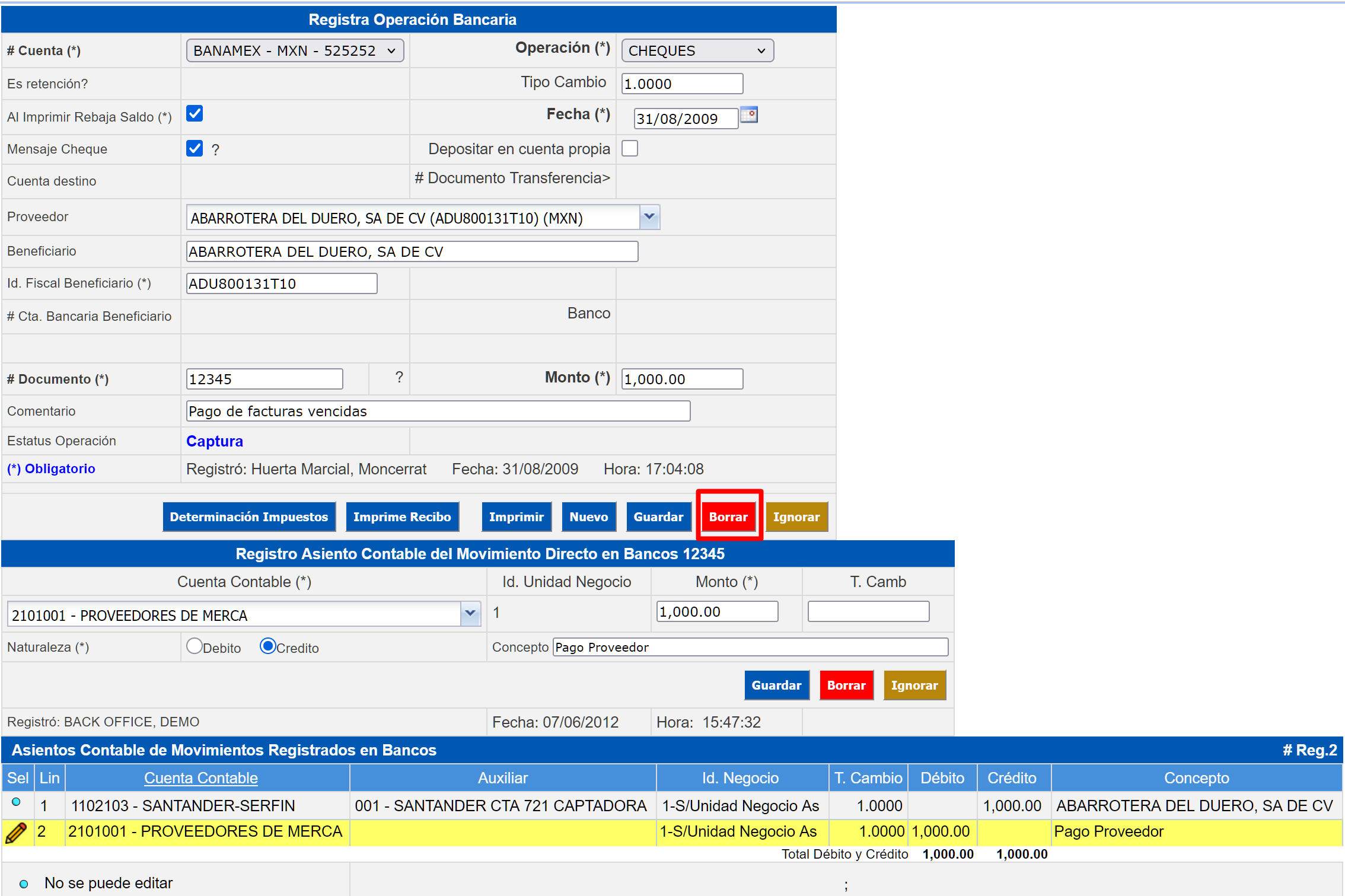 Presione el botón Borrar.Confirme la eliminación del cheque presionando el botón Ok y volverá a la pantalla inicial de Operaciones Bancarias.Se puede cancelar la eliminación del asiento al presionar el botón Cancel.Si se requiere borrar o eliminar un Detalle del Asiento Contable capturado:En la sección Asiento Contable del Movimiento Directo a Cuentas por Pagar seleccione el detalle haciendo clic en el ícono Editar.Presione el botón Borrar en la sección Registra Asiento Contable del Movimiento Directo #.Puede cancelar la eliminación del detalle presionando el botón Ignorar.