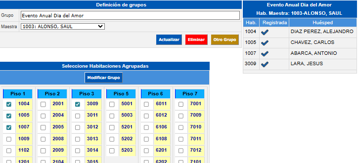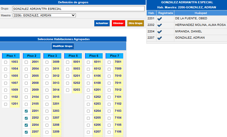 Al crear el nuevo grupo se mostrará la ventana Seleccione Habitaciones Agrupadas donde verá todas las habitaciones que están registradas y que no pertenecen a otro grupo, seleccione cada una de las habitaciones que pertenecen al grupo y haga clic en el botón Modificar Grupo.