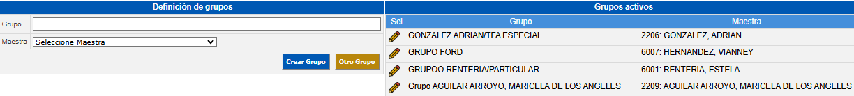 - Grupos Activos, muestra aquellos grupos que están en casa, para modificar o editar alguno, debe hacer clic sobre el ícono Lápiz ubicado a la izquierda del grupo a modificar.