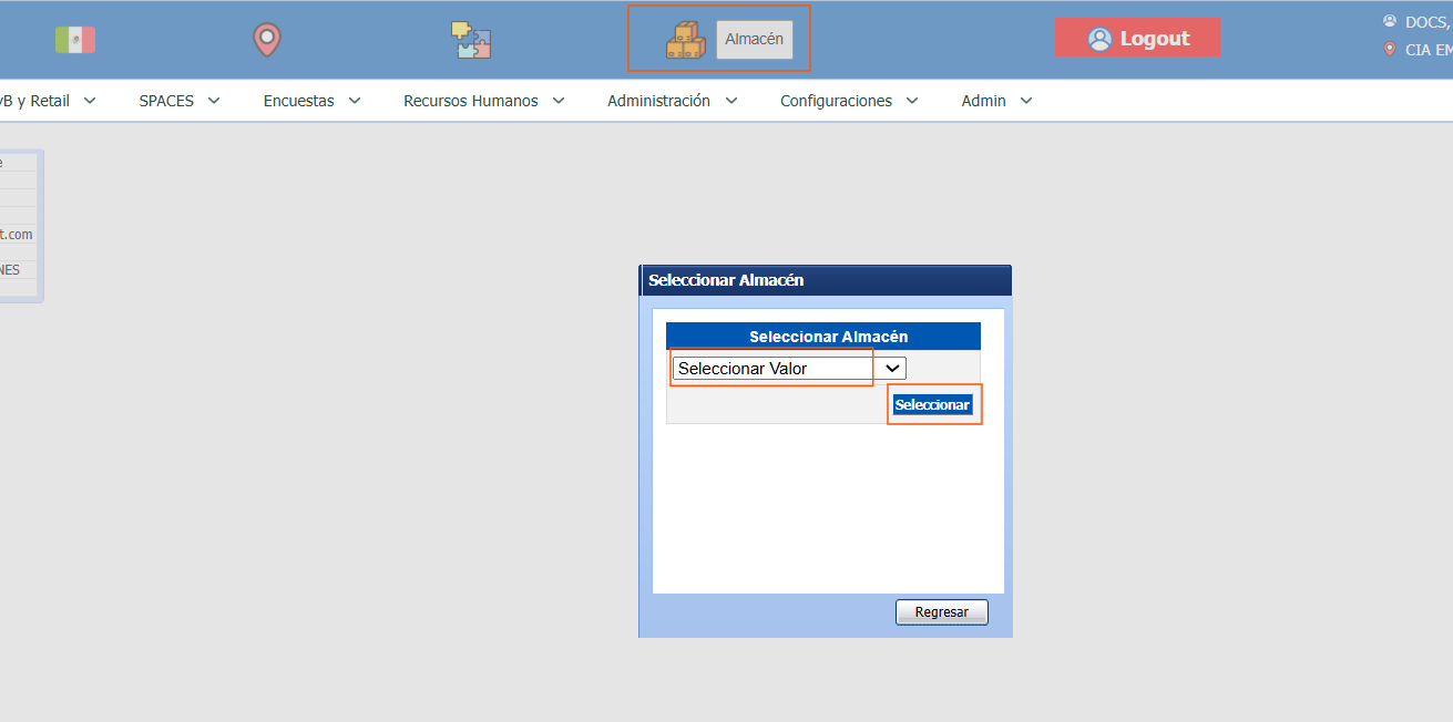 En la pantalla principal en la sección de información general del sistema, haga clic en el ícono Selecciona Almacén.
