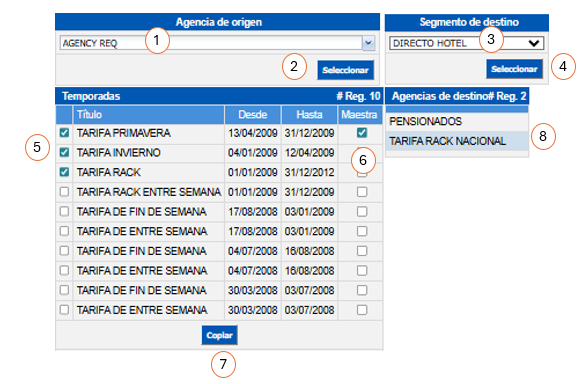 Esta aplicación permite copiar temporadas (Rate Plans) entre agencias y empresas que pertenecen al mismo segmento, acelerando la asignación de tarifas y controlando eficientemente las gestión de temporadas (Rate Plans) por segmentos.