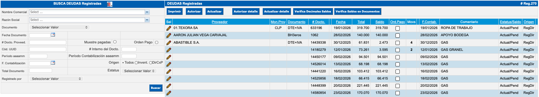 Deudas Registradas: muestra las deudas registradas del mes abierto y meses posteriores. Se permite realizar acciones masivas a las deudas del mes abierto como imprimir, autorizar, actualizar y sobre movimientos autorizar y actualizar.