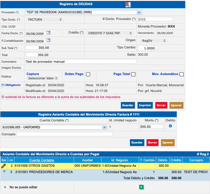 Se considera todas las obligaciones adquiridas por la empresa, en este apartado se analiza el registro de las deudas directas o de registro manual, es decir, las deudas de servicios, honorarios, arrendamientos, etc.