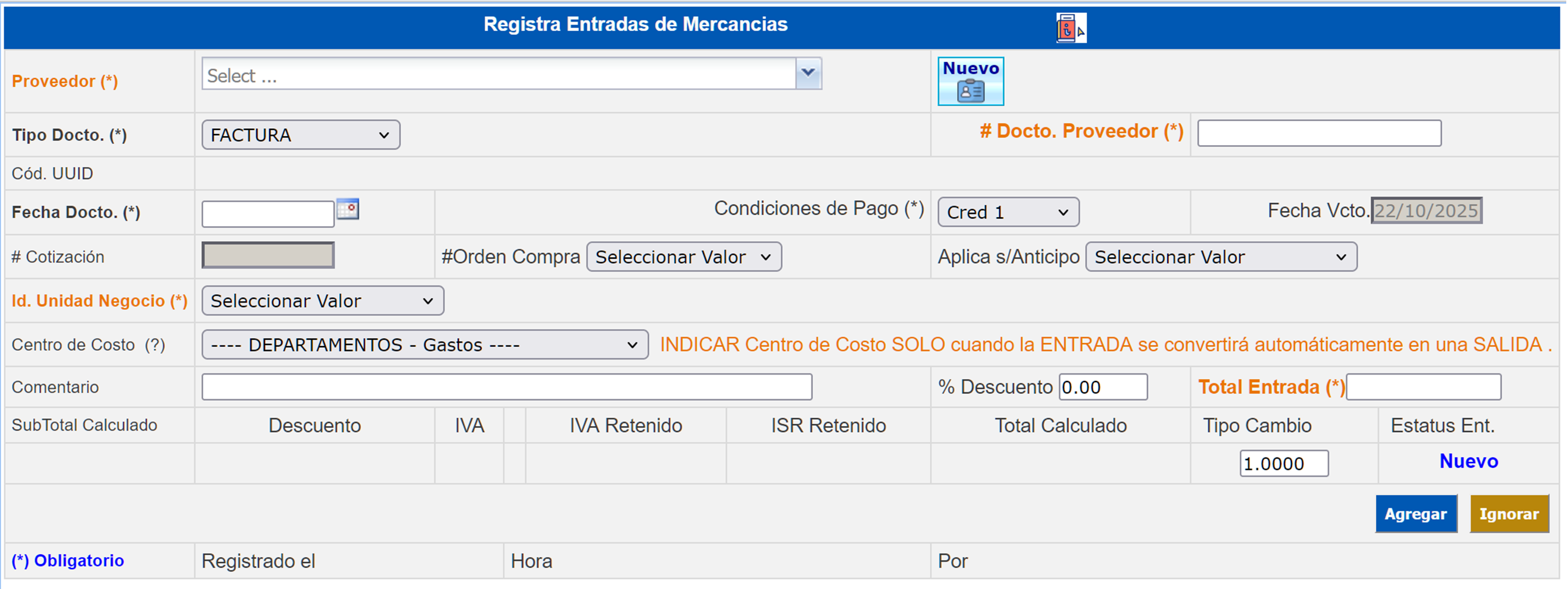 Para dar de alta o ingresar una entrada de mercancías, debe realizar los siguientes pasos: