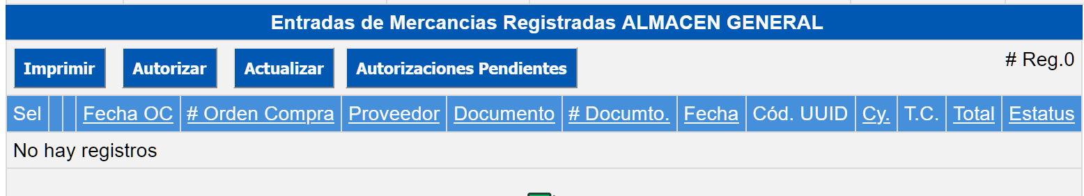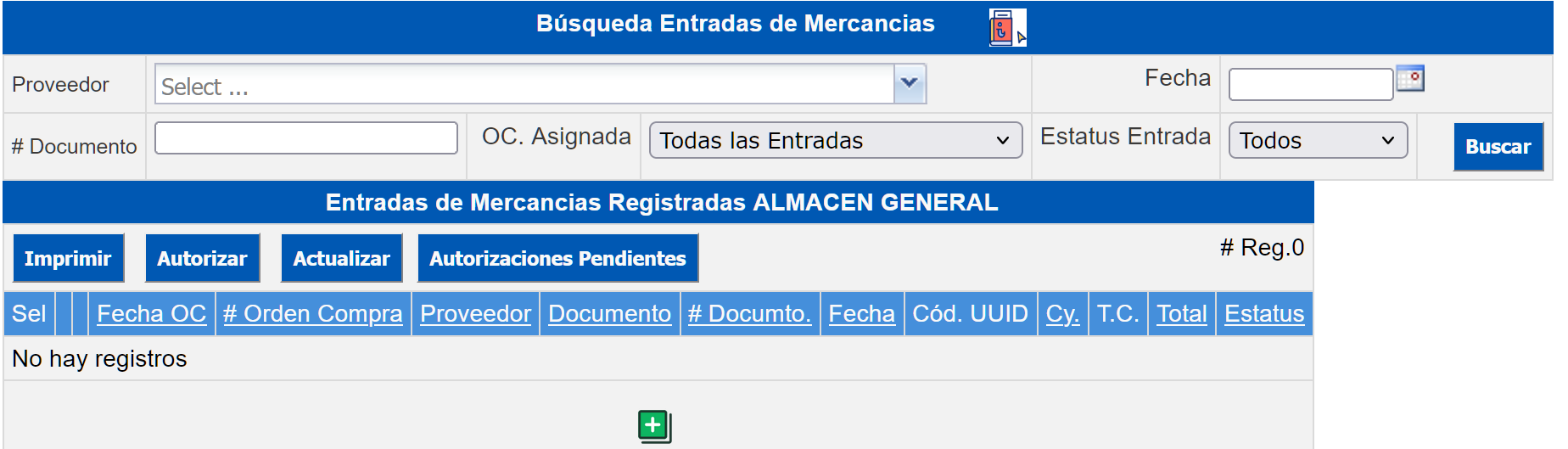 A través de esta aplicación se permite ingresar, modificar, borrar, imprimir, autorizar y buscar las entradas de mercancías al inventario. Para esto, se requiere que los productos/artículos se encuentren ingresados con anterioridad en el