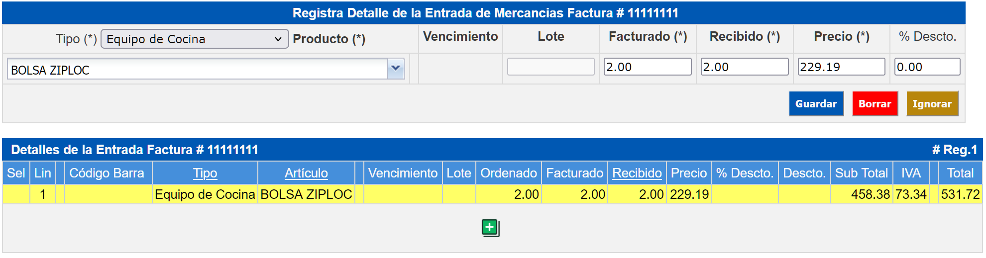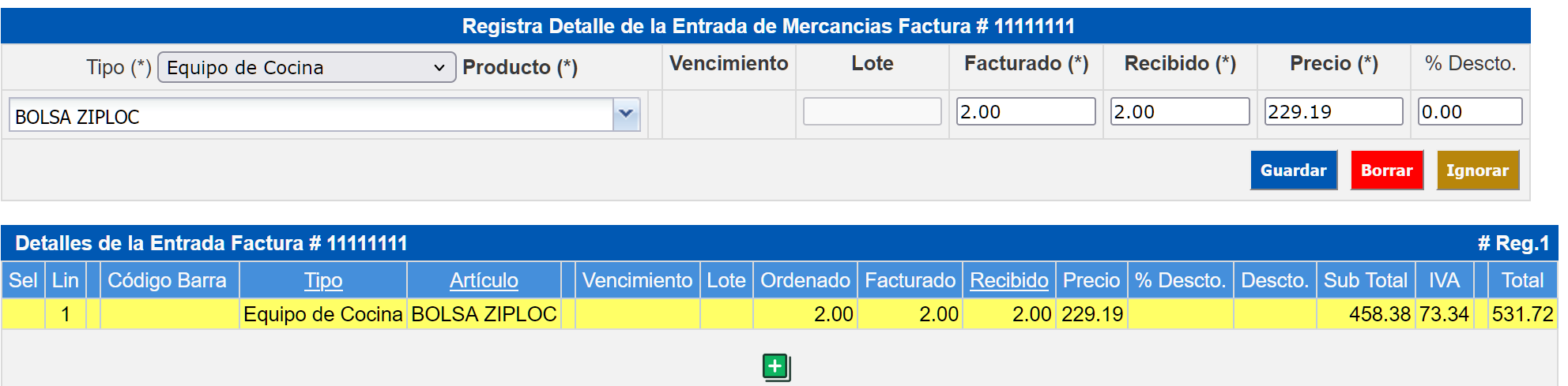 Detalle de la Entrada, se muestran los productos con las entradas ya capturadas.