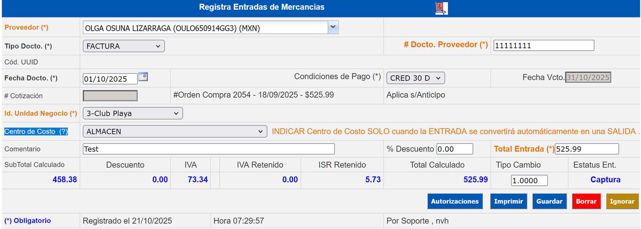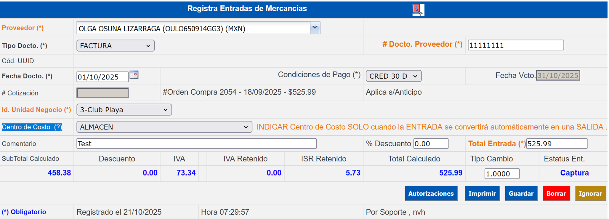 Estatus de Autorizado para proceder con la actualización. Una vez realizada la actualización no se puede modificar la entrada de mercancía. Al actualizar se afecta el kardex.