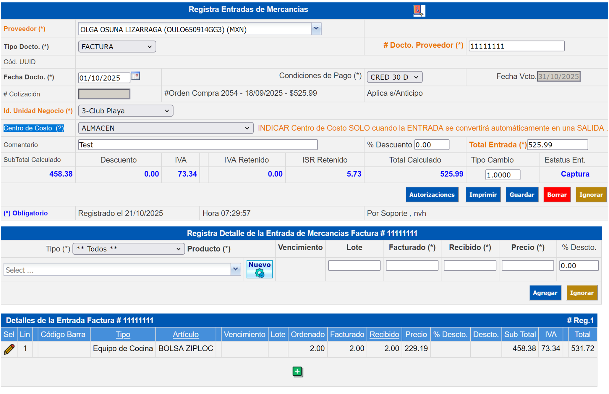 Registra Entradas de Mercancía: Se ingresa el encabezado y detalles de la factura de compra.