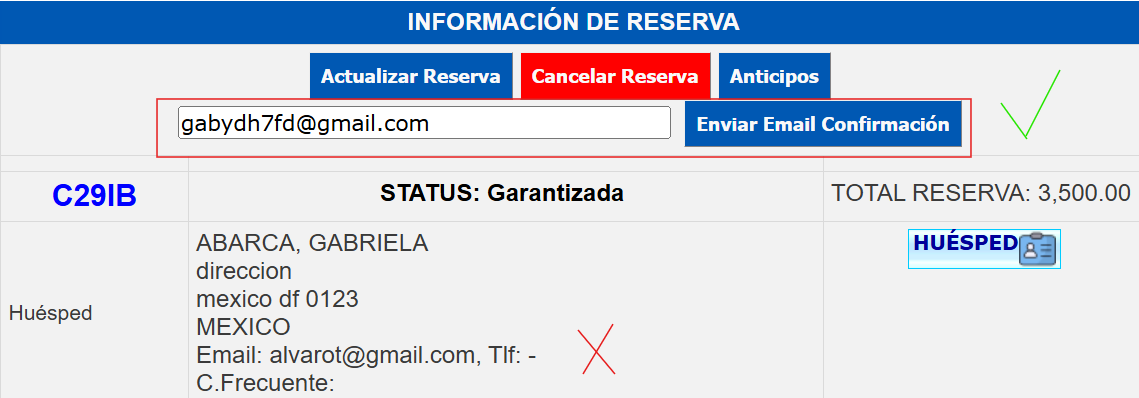 Es importante desatacar que si existe un correo en los datos del huésped pero la casilla junto al botón contiene una dirección distinta, el correo se enviará exclusivamente a la dirección indicada en esa casilla.