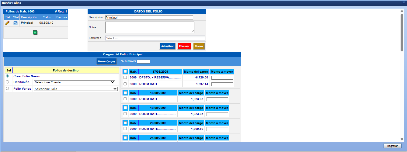 De un lado tendrá una lista de los Folios de la Habitación y del otro los datos del folio seleccionado.