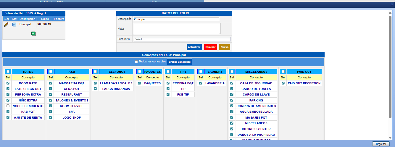 En esta ventana deberá seleccionar los conceptos que se podrán cargar en el folio.