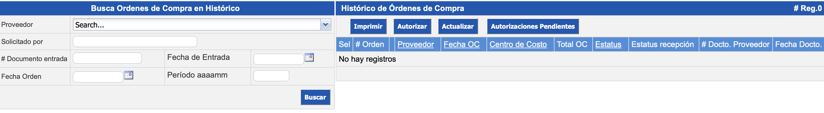 Histórico de Ordenes de Compra: despliega las ordenes de compra registradas, dando la posibilidad de mostrarlas de acuerdo a los filtros de Proveedor, Fecha OC, Centro Costo y Estatus. Además, se pueden realizar acciones masivas al ejecutar los botones Imprimir, Autorizar, Actualizar y Autorizaciones Pendientes a las órdenes de compra.
