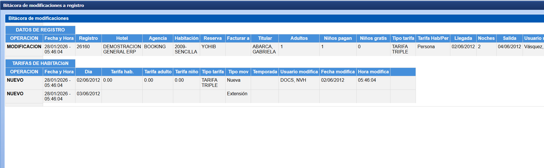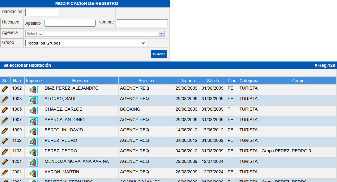 En la parte inferior se despliega el listado de registros encontrados, mostrando todos los registros activos del hotel a la fecha según los filtros aplicados. Esta tabla incluye, entre otras, las siguientes columnas informativas: