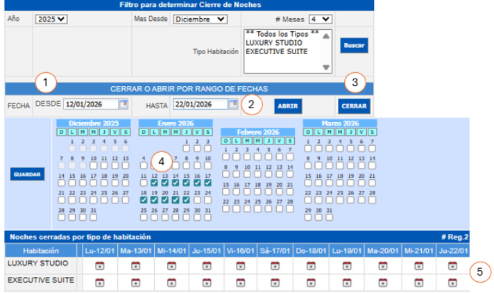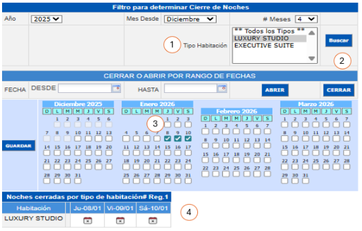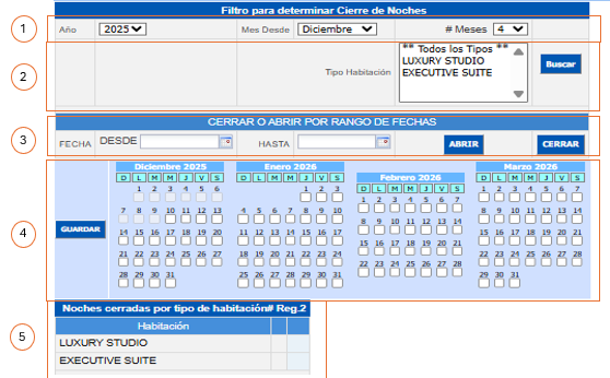Paso 5: Noches Cerradas por Tipo de Habitación: Se mostrará la lista de los Tipos de Habitación indicando si tiene la venta abierta o cerrada.