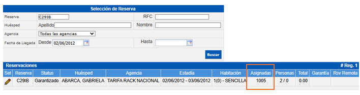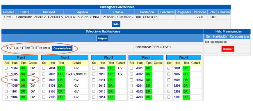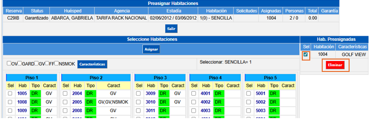 Para preasignar la habitación seleccione la casilla de la columna Sel y luego haga clic en el botón Asignar que se encuentra en la parte superior.