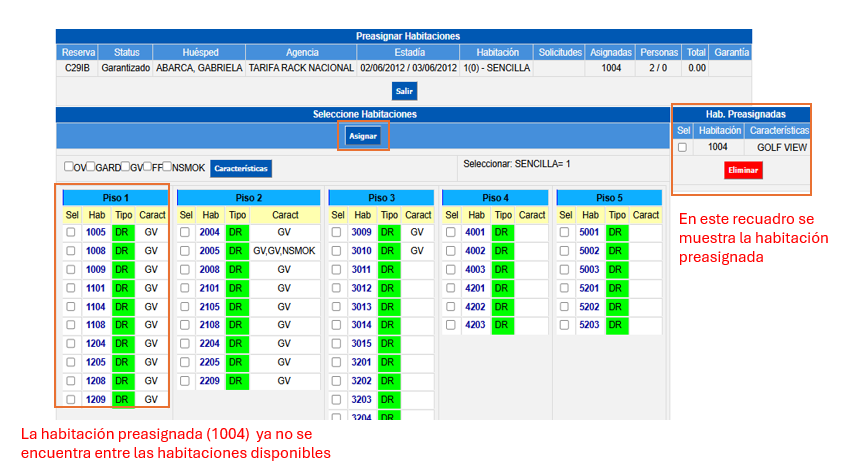 La habitación preasignada se mostrará en la sección derecha llamada Hab. Preasignada.