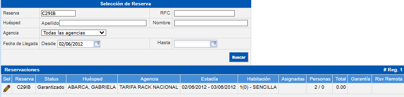 Esta sección, por default muestra todas las reservaciones a futuro partiendo de la fecha actual. En esta lista se mostrará la reserva buscada como se ha indicado en el paso anterior y podrá seleccionarla para preasignar una habitación haciendo clic en el icono Lápiz.