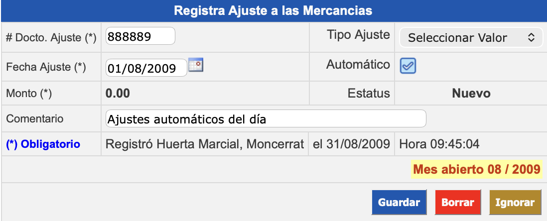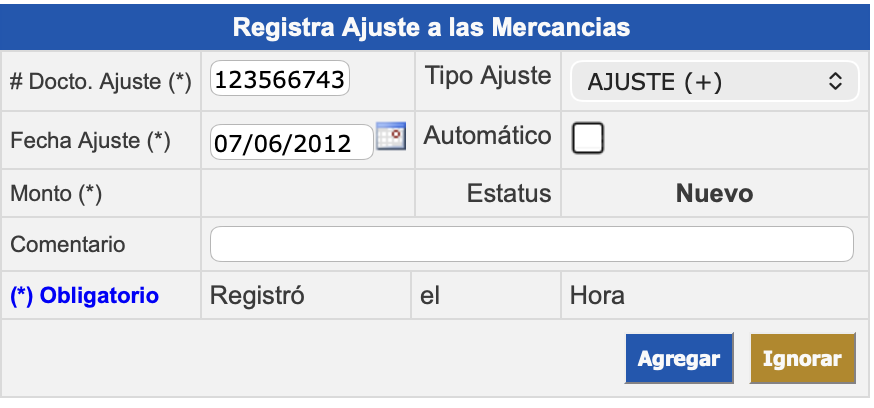 En la sección Registra Ajuste a las Mercancías, ingrese la información correspondiente de los siguientes campos: