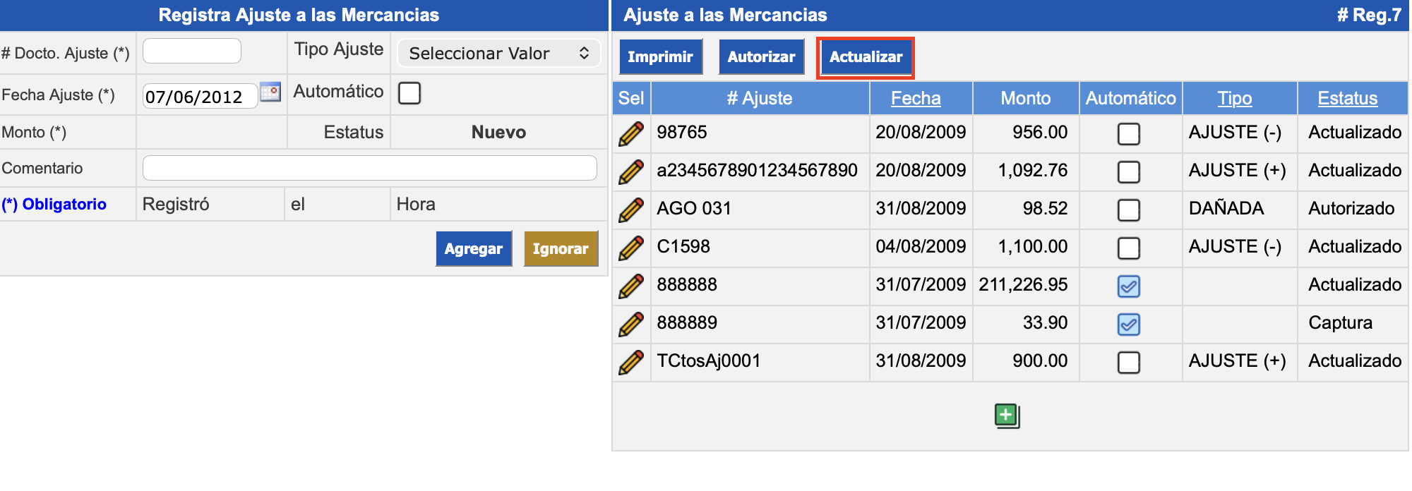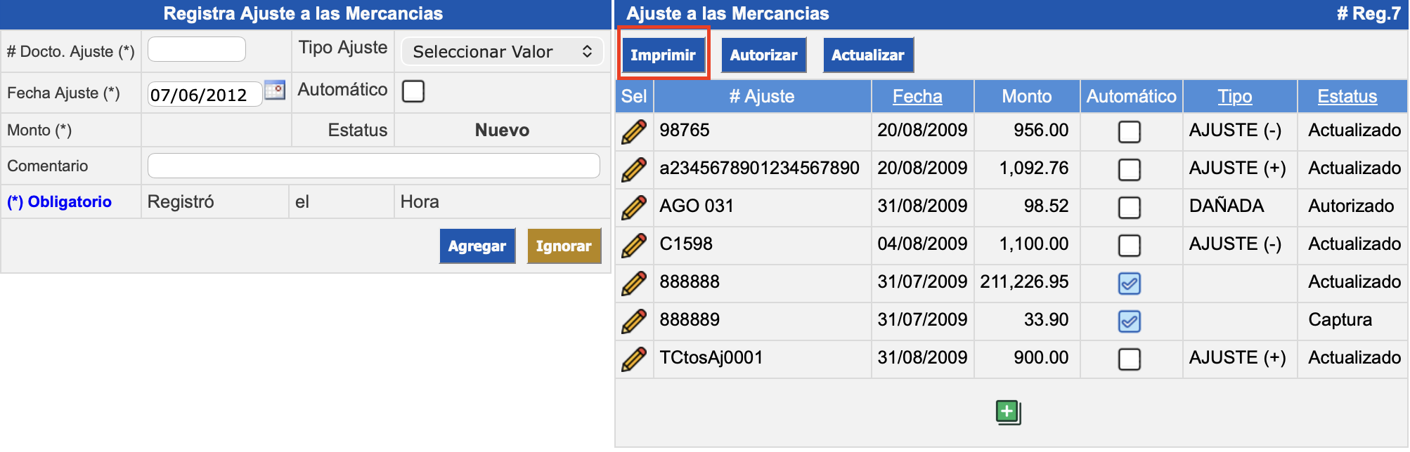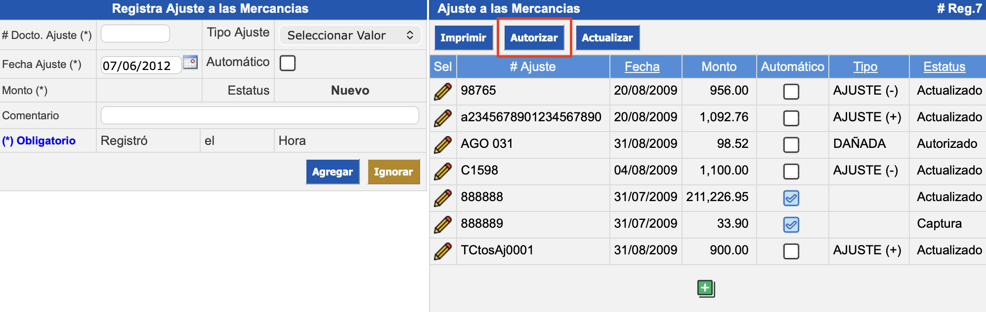 Ajuste a las Mercancías: se despliegan los ajustes ya ingresados, permitiendo visualizarlos de acuerdo a los filtros de fecha, tipo y estatus. Además, se pueden realizar acciones masivas ejecutando los botones Imprimir, Autorizar y Actualizar a los ajustes.