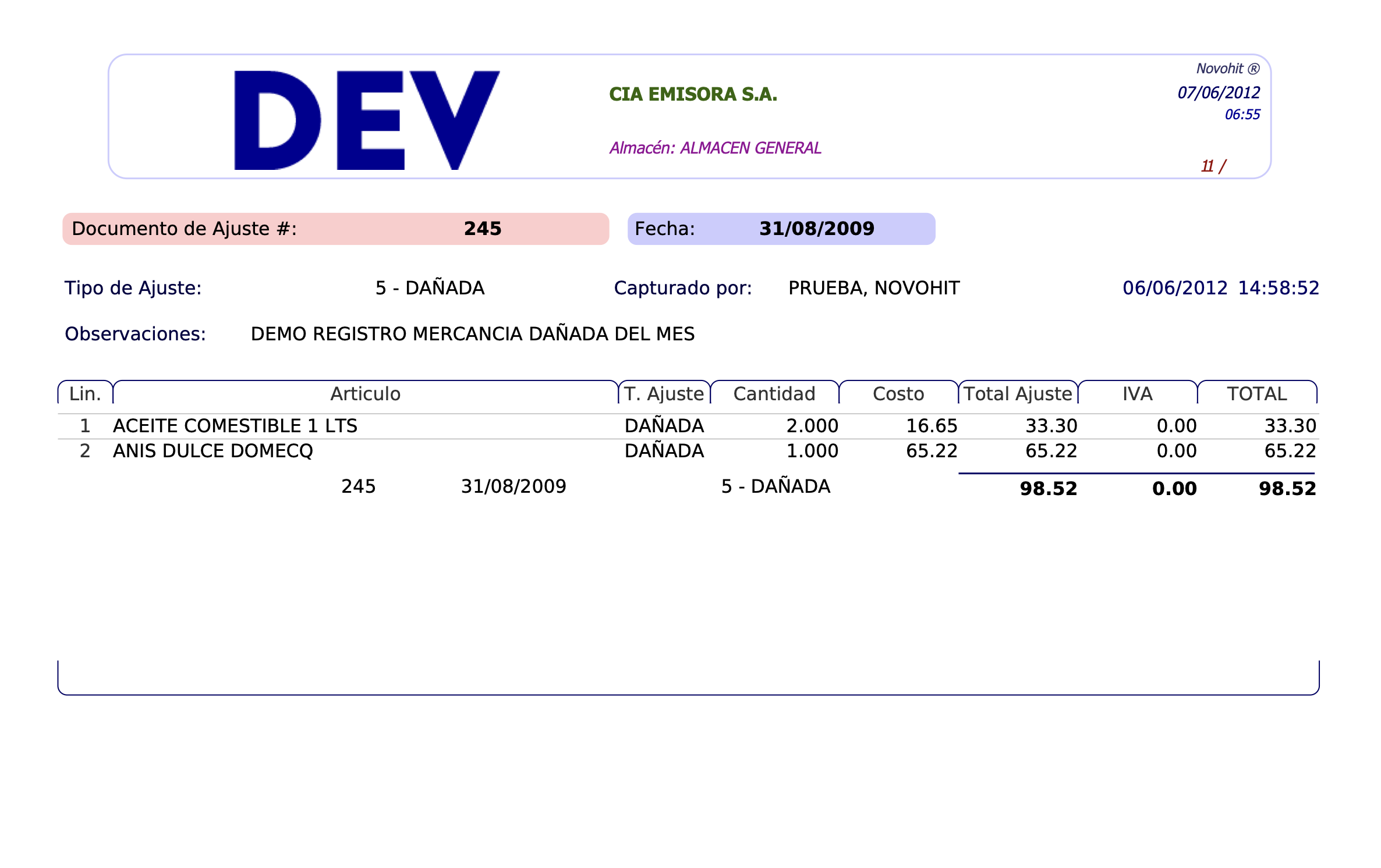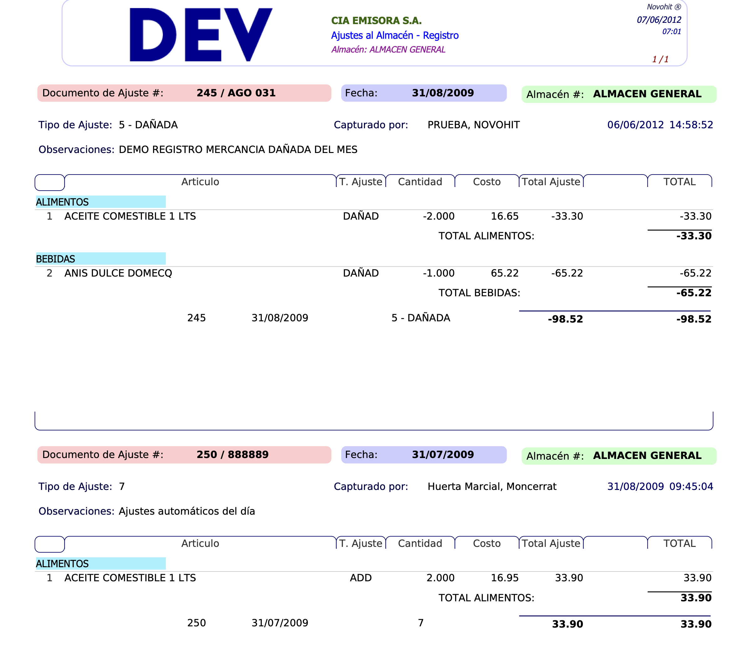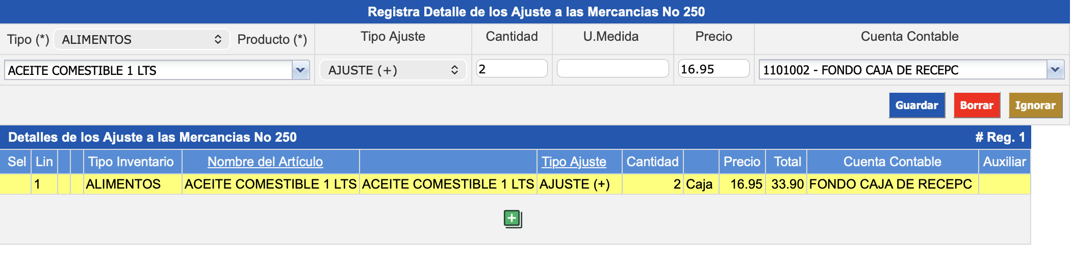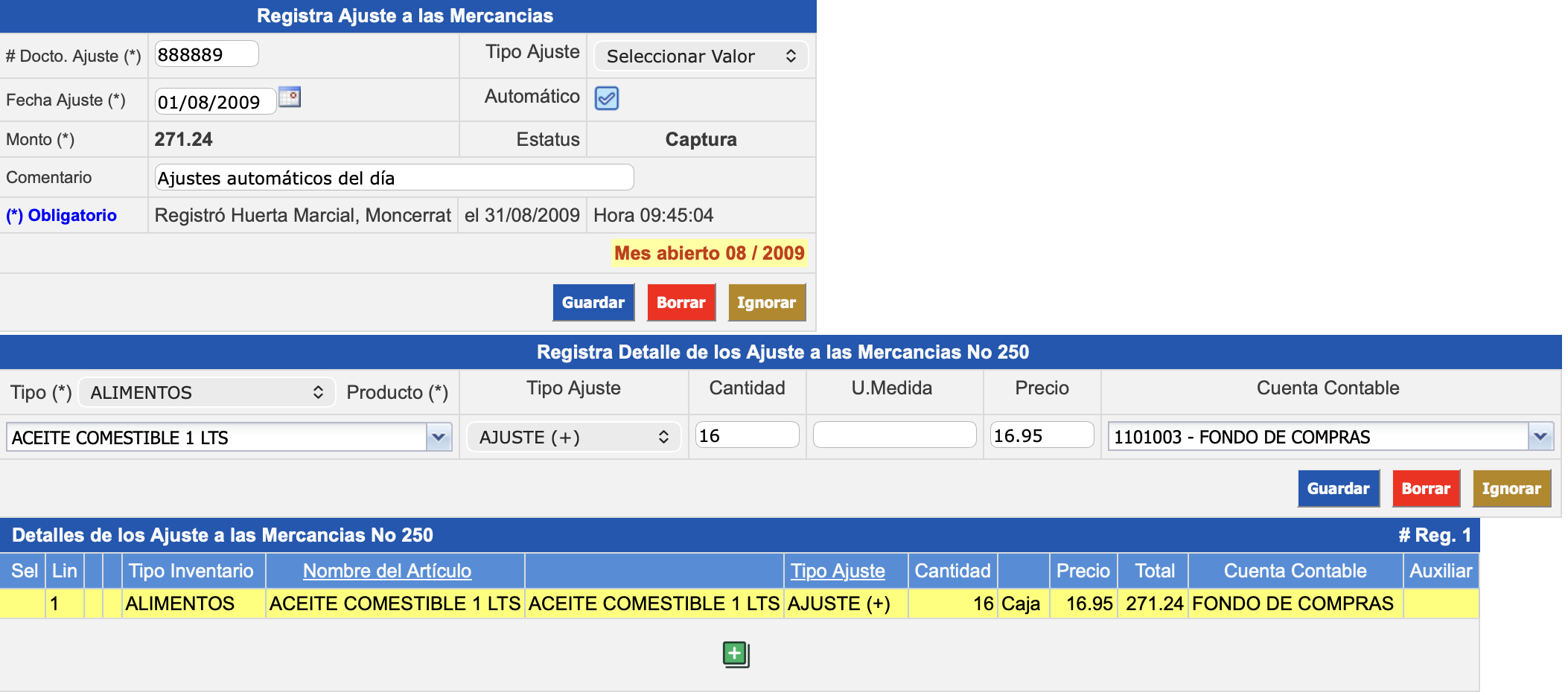 Captura: El ajuste está a nivel de registro, se puede imprimir, modificar o borrar.
