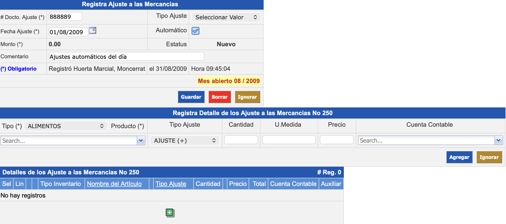 Nuevo: Sólo esta capturado el encabezado del ajuste, no tiene registrado detalles.