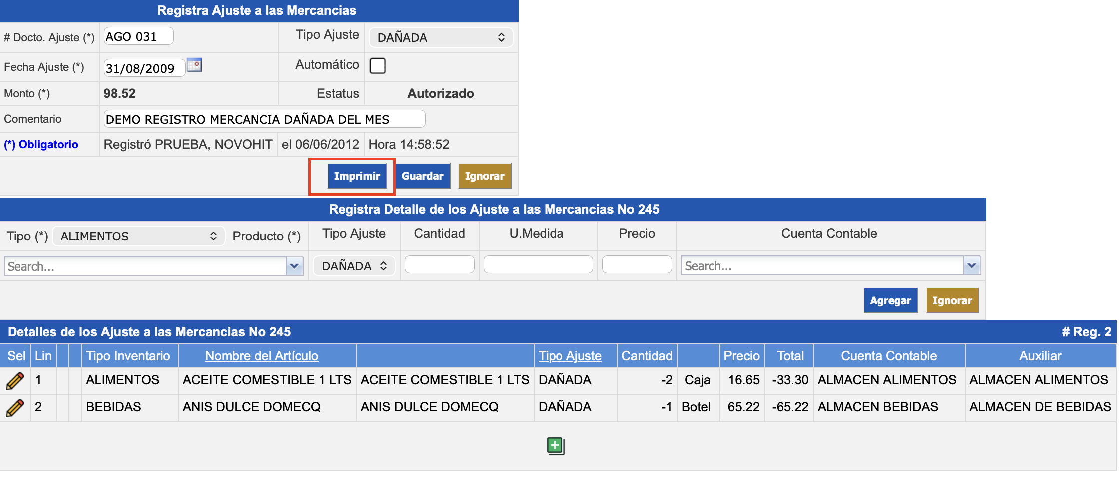 En la sección Registra Ajuste a las Mercancías presione el botón Imprimir.