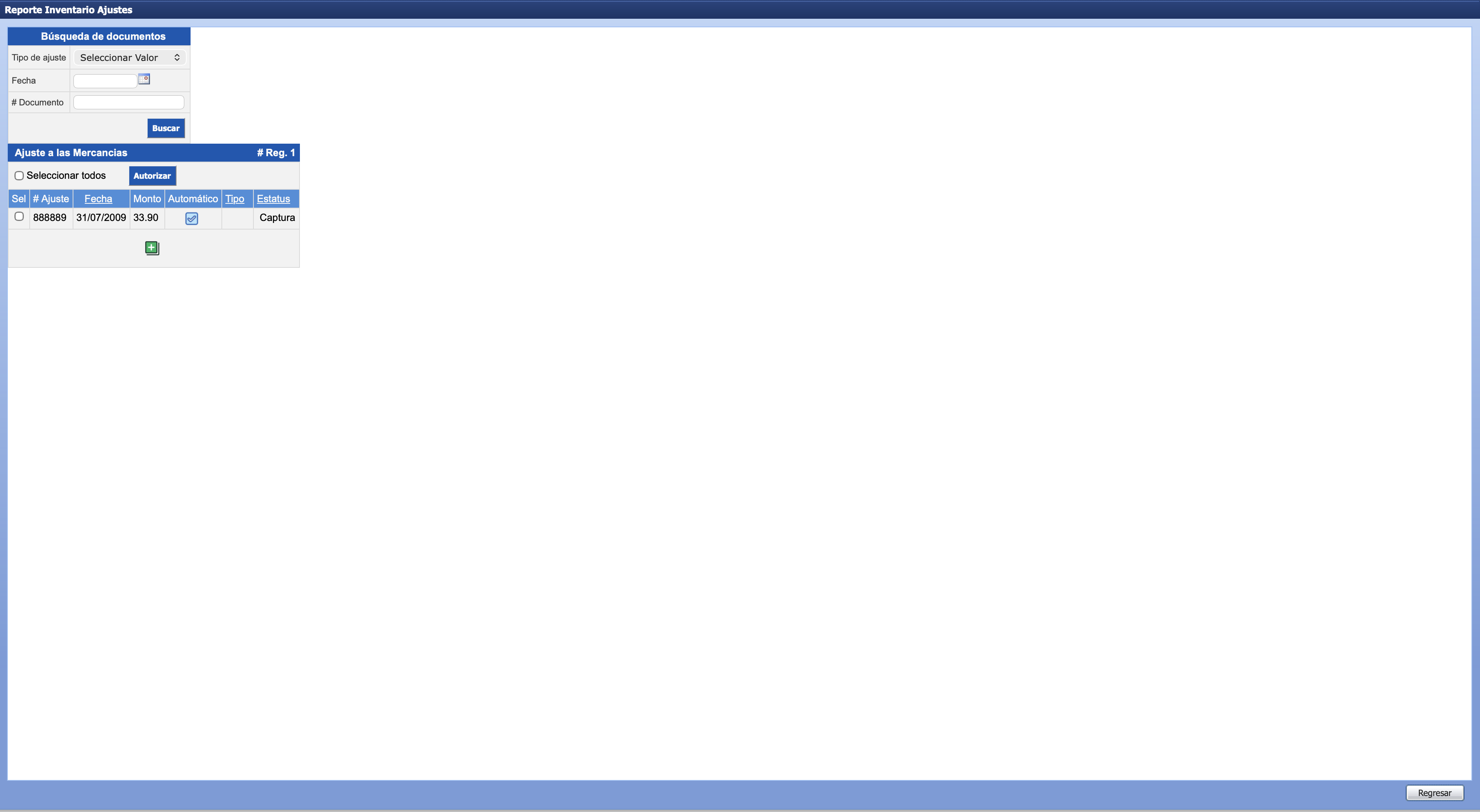 En la ventana Inventario Ajuste, muestra la sección Búsqueda de Documentos donde se puede buscar los ajustes a autorizar.