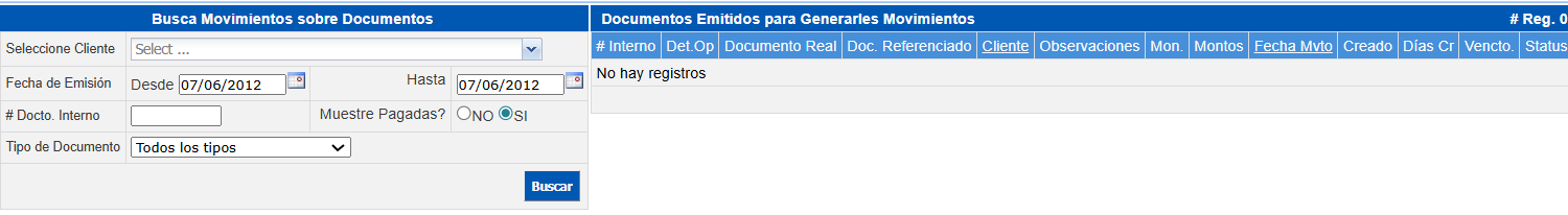 Documentos Emitidos para Generarles Movimientos: Despliega las facturas ya emitidas y capturadas en el sistema, sobre las cuales se pueden registrar nuevos movimientos.