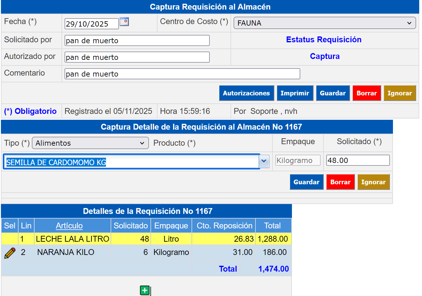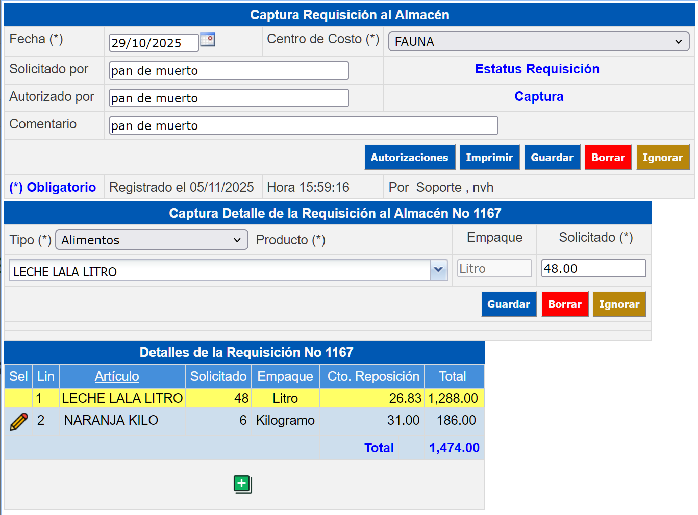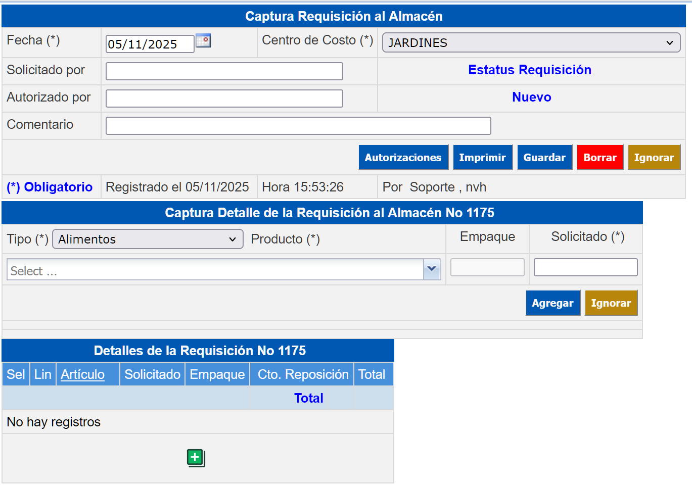 Campo Descripción Tipo * Seleccione el tipo de inventario al que pertenece el producto que se le realizará la requisición de mercancía. Producto * Ingrese el nombre del producto que se solicita. Solicitado * Importe de mercancías que se solicita en la requisición.Presione el botón Agregar.En la sección Detalles de la Requisición No. XXX se muestran los productos ya capturados.