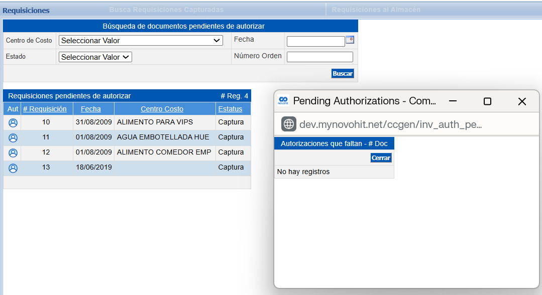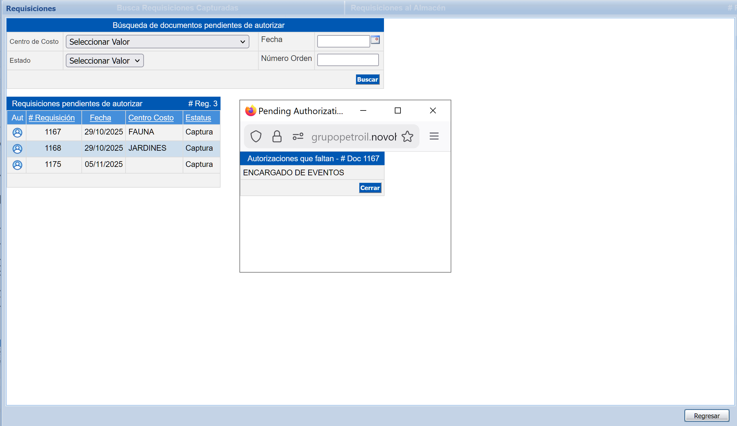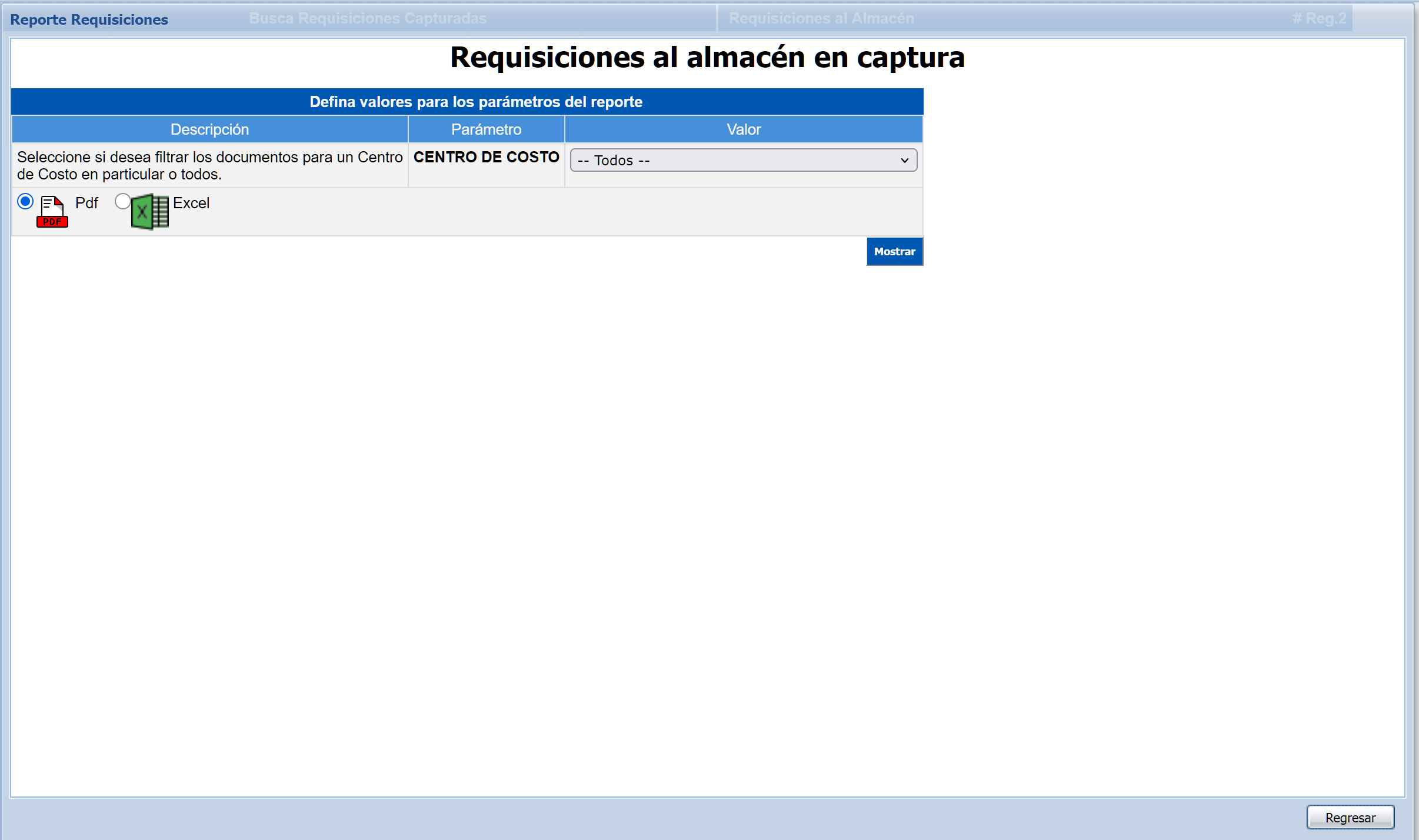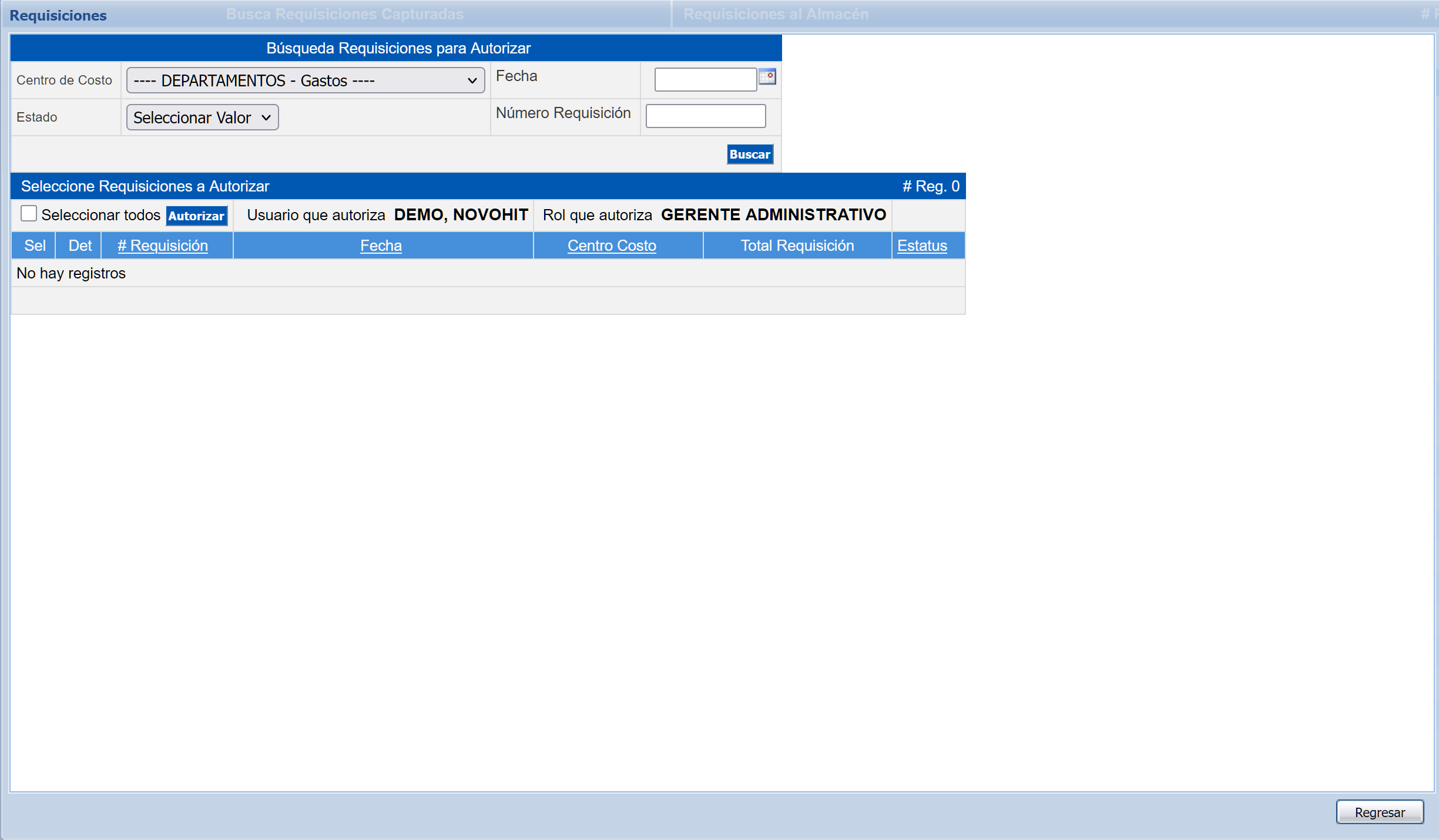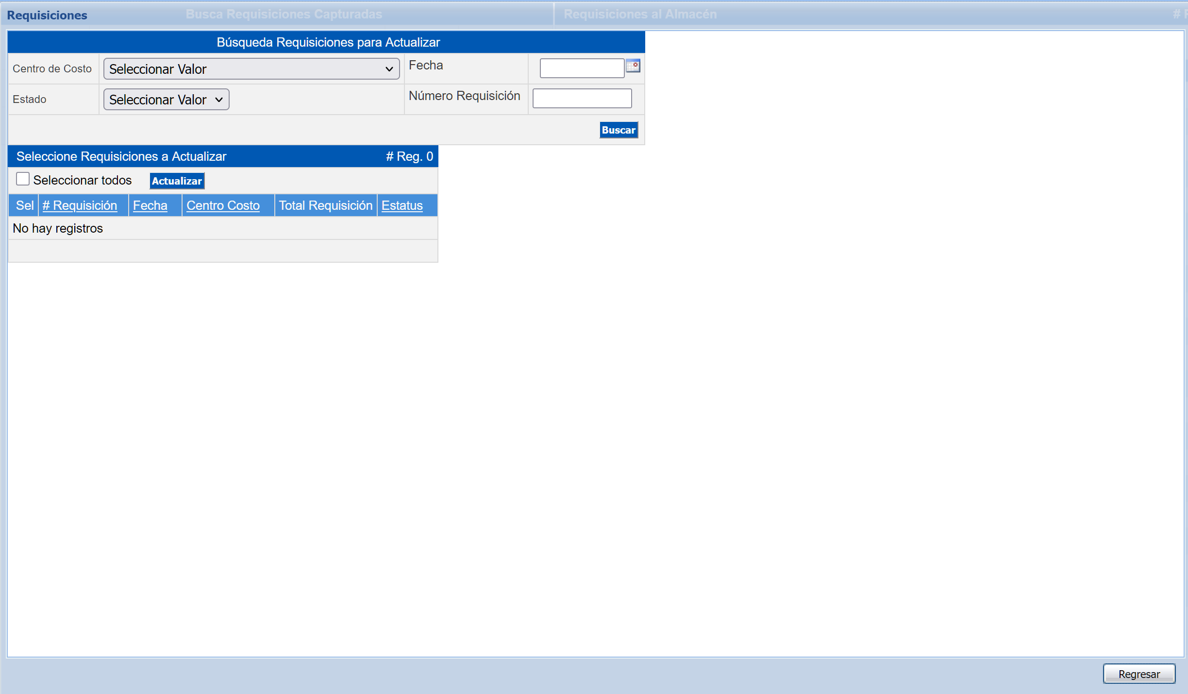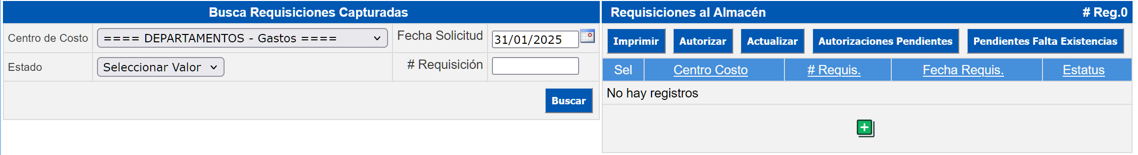 Búsqueda de Requisiciones Capturadas: Permite realizar búsqueda de las requisiciones de mercancías ya registradas.Requisiciones al Almacén: Despliega las requisiciones registradas, permitiendo mostrarlos de acuerdo a los filtros de Centro Costo, Fecha Solicitud, y Estatus, #Requisición. Además, se pueden realizar acciones masivas ejecutando los botones Imprimir, Autorizar, Actualizar, Autorizaciones Pendientes y Pendientes Falta Existencias.