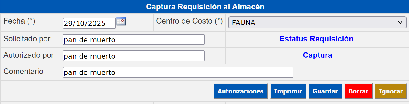 Campo Descripción Fecha * Día de la solicitud de la mercancía dd/mm/aaaa, o haga clic en el calendario. Centro de Costo * Identifique el centro de costo o departamento de gasto y seleccione el que corresponda. Solicitado por Nombre de la persona o departamento que esta solicitando la mercancía. Autorizado por Nombre de la persona o departamento que autoriza la entrega de la mercancía Comentario Capture información referente a la requisición de mercancía.Presione el botón Agregar.Capture el detalle de la requisición en la sección Captura Detalle de la Requisición al Almacén No. X digitando la información correspondiente de los siguientes campos: