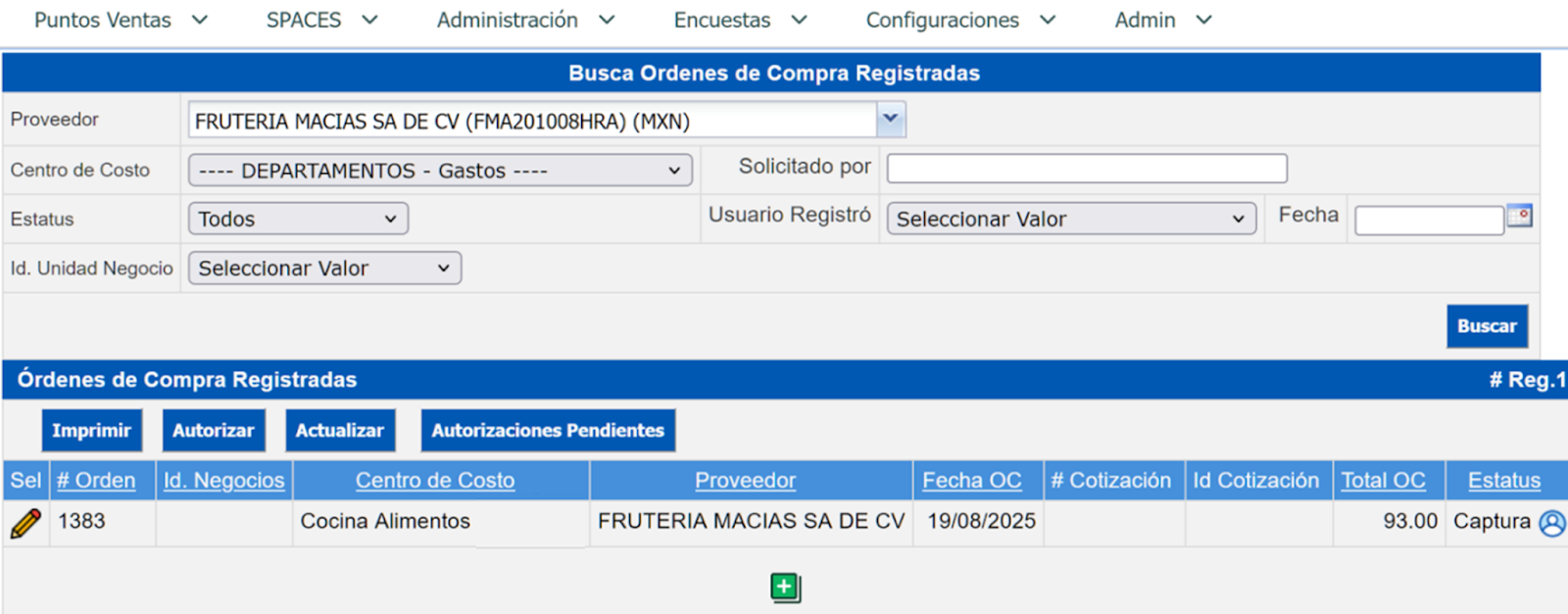 En la ventana Requisiciones, se muestra la sección Búsqueda de documentos pendientes de autorizar donde se puede buscar aquellas requisiciones que se revisen.En la aplicación Registra e Imprime Órdenes de Compra se puede realizar la búsqueda por proveedor o fechaLos datos del encabezado de la orden de compra provienen de la información de la requisición son Solicitado por, Centro de Costo y Comentario