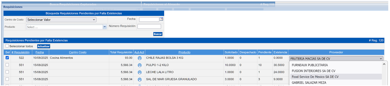 En la sección Requisiciones Pendientes por Falta Existencia Realice las siguientes acciones: