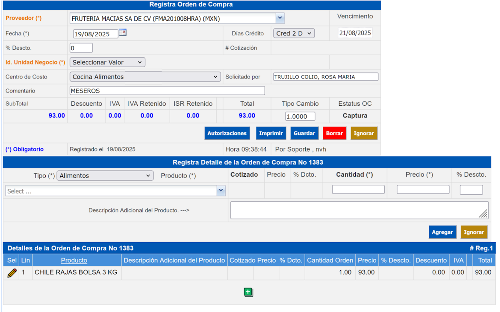 La orden de compra puede ser modificar la cantidad solicitada o agregar más productos.