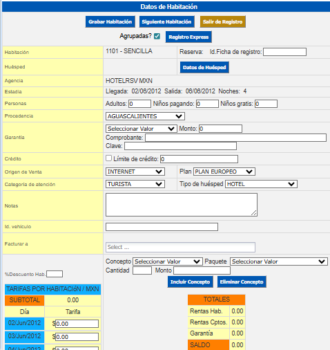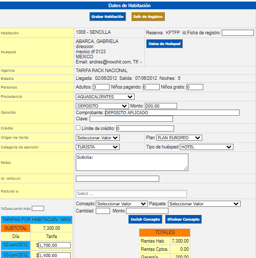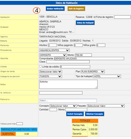 Abrirá la ventana Datos de Habitación donde deberá agregar la información del huésped, forma de pago, procedencia, etc.