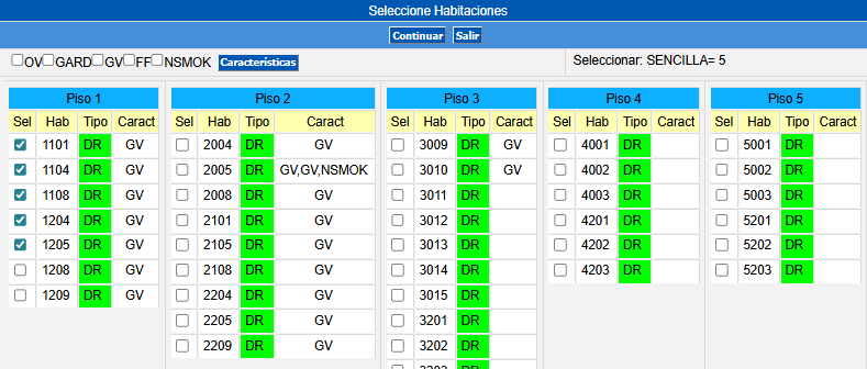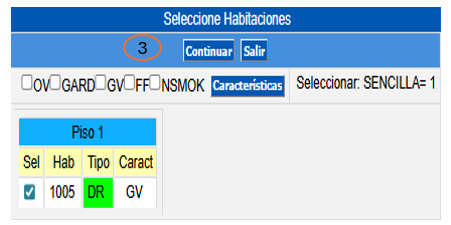 En el caso de que la reservación tenga habitaciones preasignadas éstas serán las únicas que se mostrarán, sólo deberán hacer clic en Continuar.