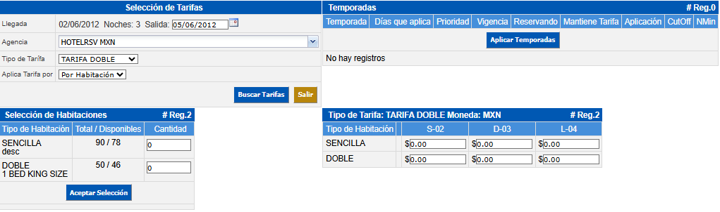 Se mostrarán las tarifas para cada tipo de habitación en la ventana inferior derecha, esta información es sólo de consulta.