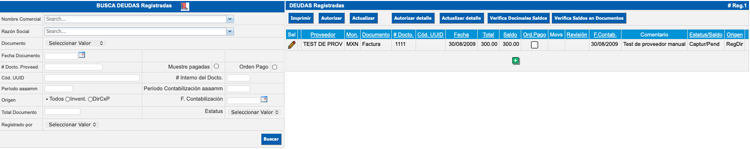 - REG: son las facturas capturadas manualmente que no son inventariables. Permite modificar y eliminar el encabezado de la deuda y detalles del asiento contable.